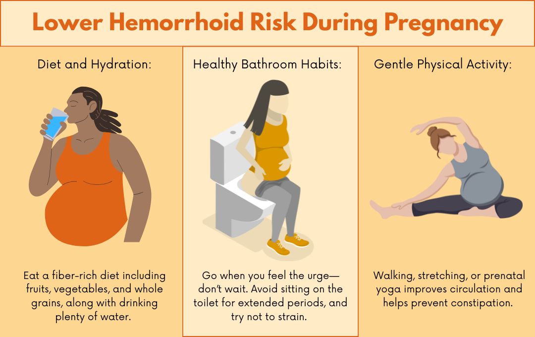 If hemorrhoid symptoms like pain or bleeding become severe or if hemorrhoids don’t improve with self-care during pregnancy, seek medical attention.