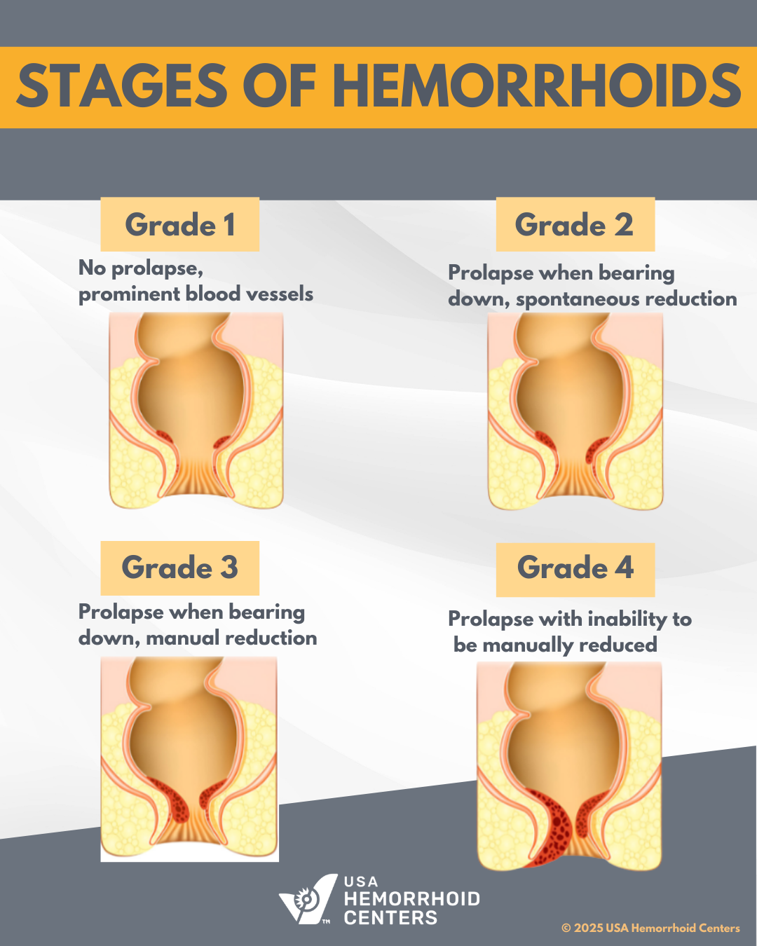Medical professionals use a specific grading system to determine how far the hemorrhoidal tissue has moved from its original position.